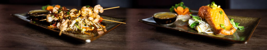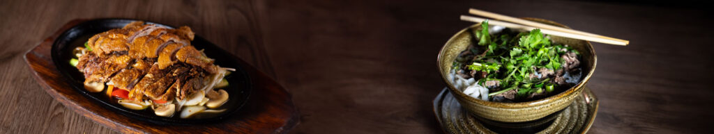 mit Rindfleisch, Salat, Gurke, Koriander, Erdnüssen und Rostzwiebeln